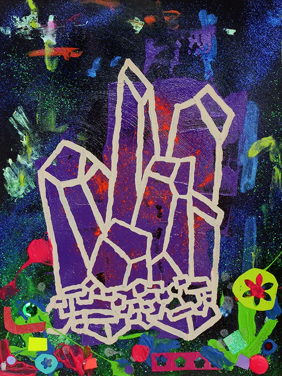 Acrylic, glitter, rhinestones, mixed media on mattboard mounted on panel, 2017, 40 x 53cm